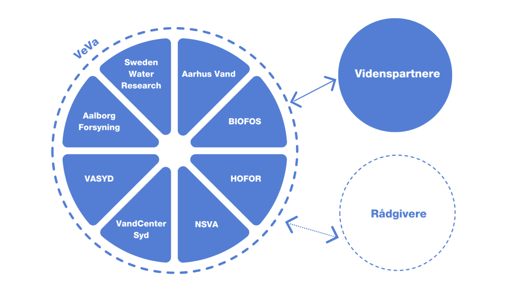 Illustration af partnerskabet i VeVa samarbejdet vist sammen med relationer til videnspartnere og rådgivere (© VeVa – illustrationen må kun gengives med tilladelse og reference til VeVa).